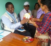 Local communities in Nala, Kavre, welcome the UNICEF Country Chief Mr. Stanley Chitekwe and his associates Mr. Anirudra Sharma withh tika and flowers on July 12, 2017.